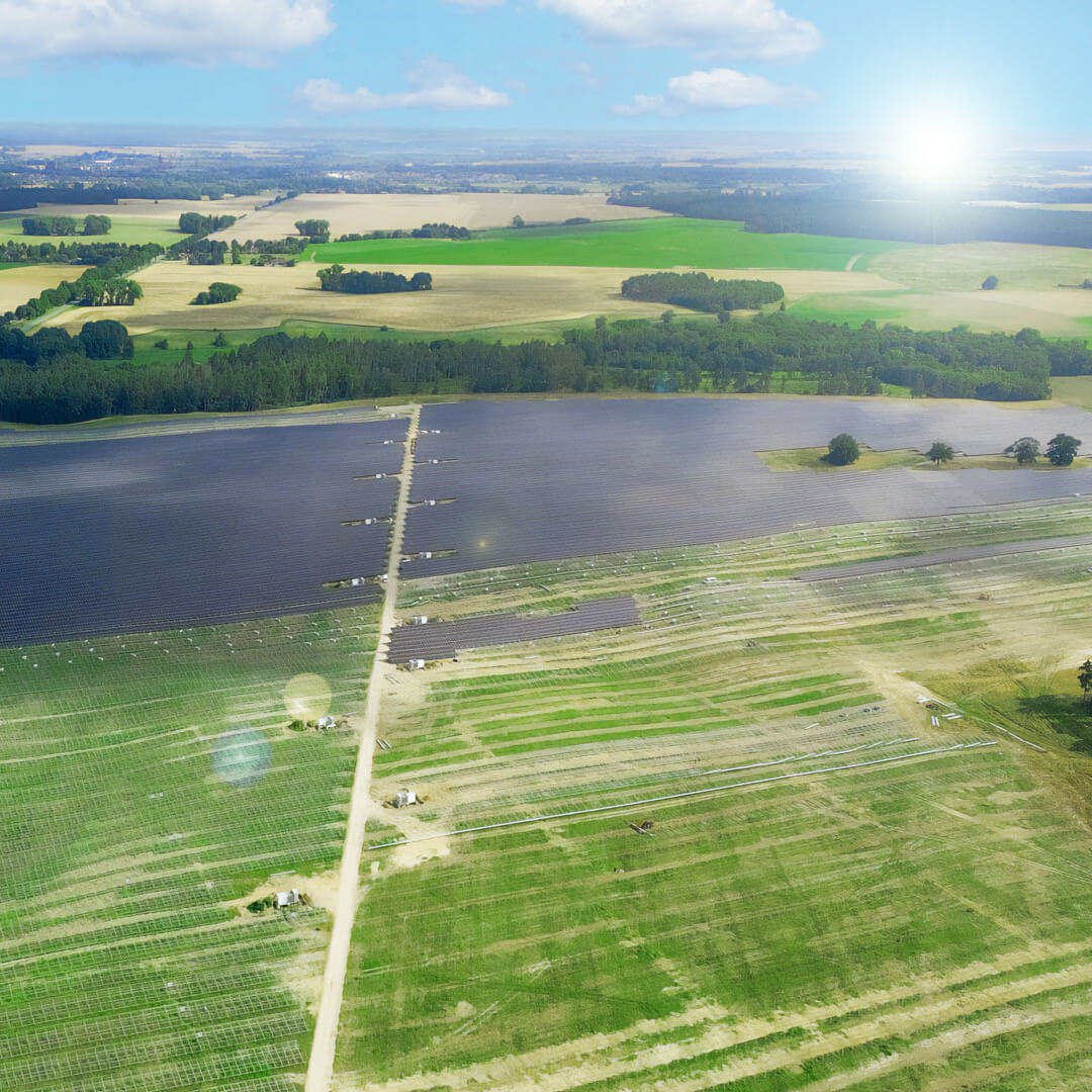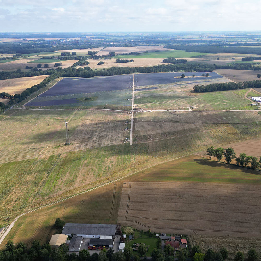 For our customer Encavis, we are implementing a PV project with an installed capacity of 114 megawatts near Borrentin in the district Mecklenburgische Seenplatte (Germany). Once completed, almost 200,000 modules will convert sunlight into electricity. An area of 964,600 square metres, or the equivalent of 135 soccer fields, will produce enough green electricity to meet the annual demand of around 35,000 households.